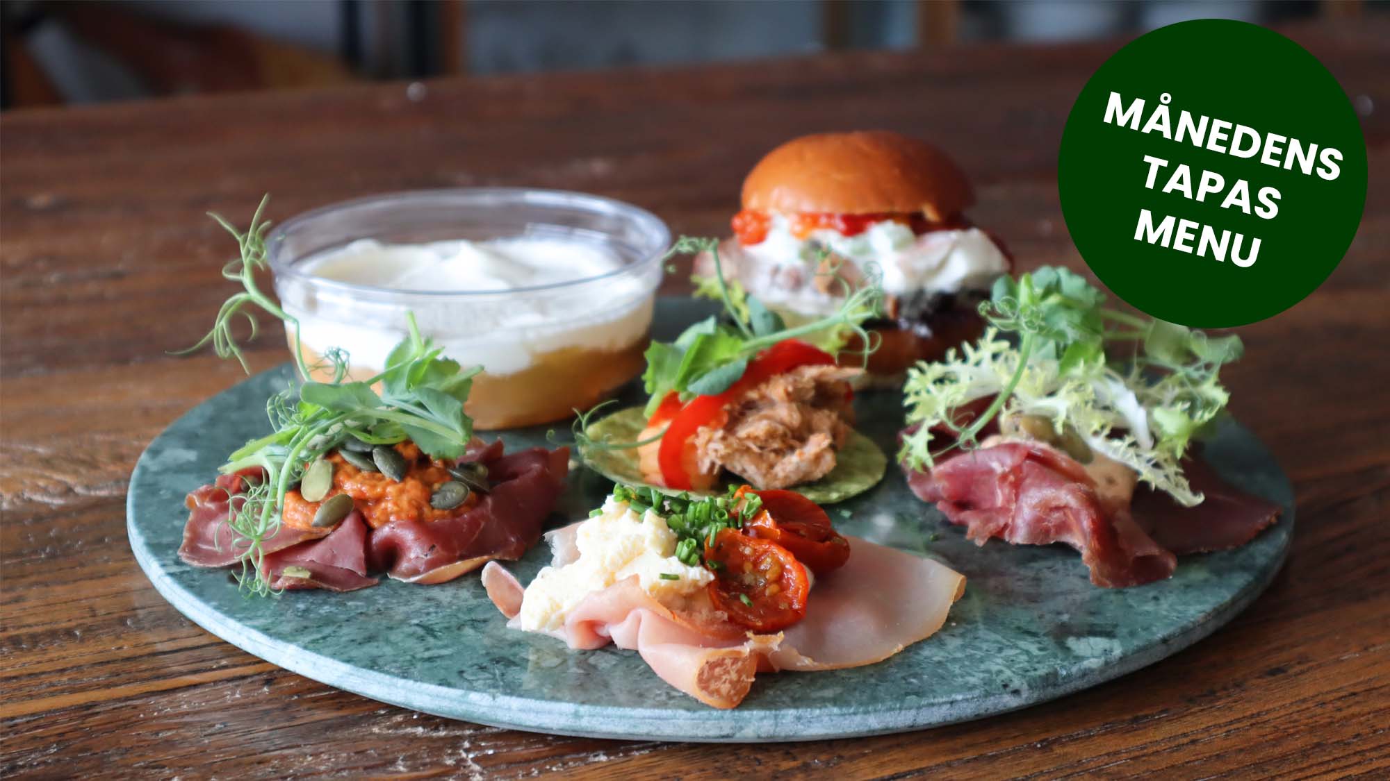 Røget okseinderlår, langtidstørret fra Krastrupsøgaard med bruschetta mayo og grillet oliven